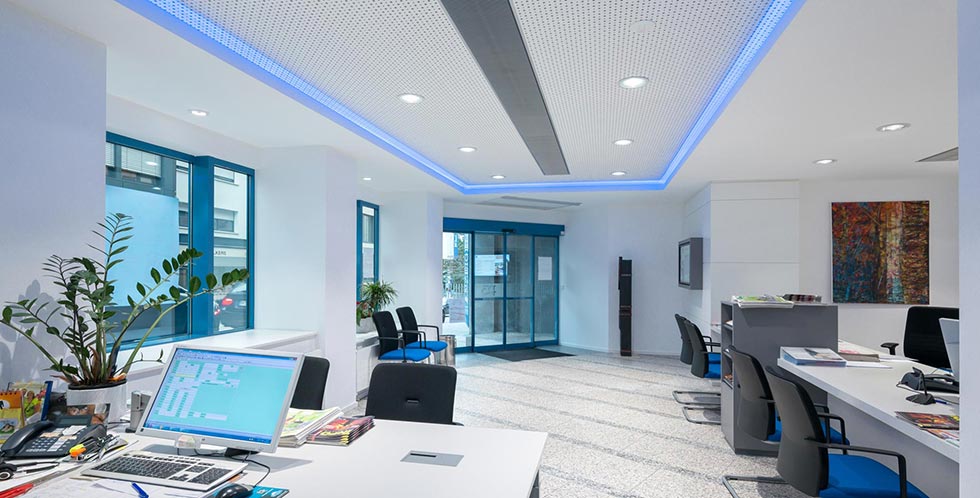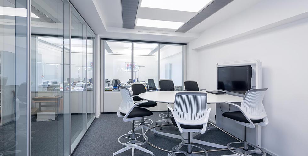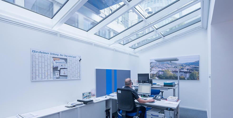 In der Anzeigenannahme werden Kunden bei der Planung und Schaltung ihrer Inserate betreut – in einem Arbeitsumfeld, das heutigen Anforderungen an Funktionalität, Transparenz und Aufenthaltsqualität gerecht wird. Die Räume der Anzeigenannahme sowie die angrenzenden Büroflächen wurden umfassend neu gestaltet. Aufgrund der innerstädtischen Lage waren bauliche Erweiterungen nicht möglich. Daher lag der Fokus auf einer optimalen Nutzung der vorhandenen Flächen. Auch Arbeitsplätze im Tiefgeschoss wurden in diesem Zuge modernisiert und deutlich aufgewertet. Mehr Licht, Offenheit und akustischer Komfort prägen nun das Erscheinungsbild: Schallschutzverglasungen, transparente Raumabtrennungen sowie Oberlichter mit Brandschutzverglasung sorgen für eine zeitgemäße, helle und funktionale Arbeitsatmosphäre.